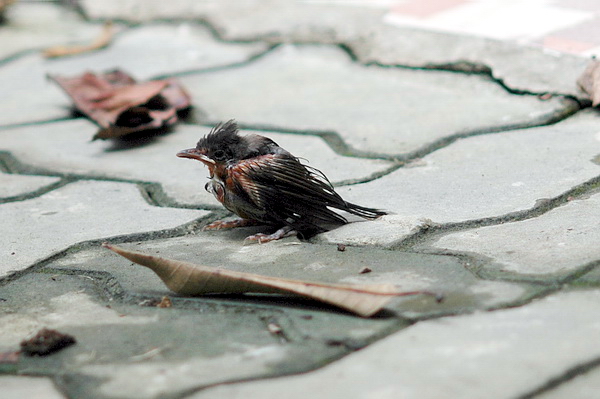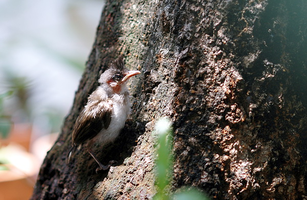 ของวันที่ 1 เมษายน 2549 Family member พบลูกนกหัวจุกตัวเปียกปอน อยู่ในทางระบายน้ำภายในบริเวณบ้าน จึงนำมาเช็ดเนื้อเช็ดตัวให้แห้งแล้วป้อนด้วยไข่(แดง)ต้ม เมื่อเห็นแข็งแรงดีขึ้นมากแล้ว ก็นำไปวางไว้บนสแลนกรองแสงเรือนกล้วยไม้นอกบ้าน เพื่อที่จะให้พ่อแม่นกสามารถมองเห็นได้ง่าย...ช่วงที่ผมกลับเข้าบ้านเพื่อหยิบกล้องไปบันทึกภาพ เจ้านกน้อยก็ย้ายที่ไปแล้ว มองหาอยู่ตั้งนาน แล้วก็พบว่าหลบมาอยู่ที่นี่เอง...